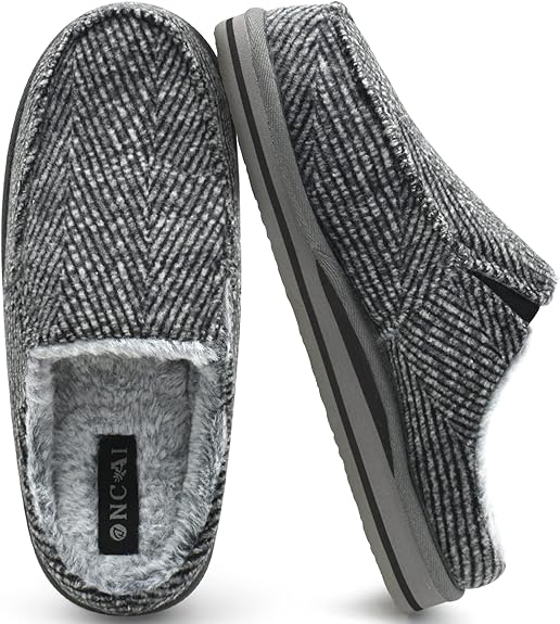 Mens Clog Slippers with Arch Support Stripe Faux Fur Cotton-Blend High-Density Memory Foam Warm House Slippers Slip-on Indoor